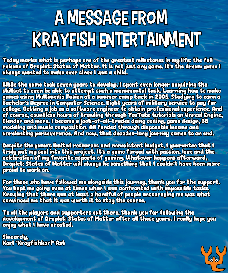 Hey guys, Krayfishkarl here and welcome to a special announcement. Version 1.0 of Droplet: States of Matter is now available. This update brings the game out of early access and into its full release. Additionally, the official soundtrack has been made available for separate purchase on Steam. There are seventy six songs spread across nearly three hours of music.