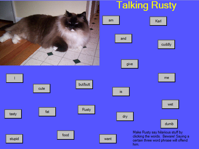 Now get ready for something a little eccentric. You can click on different buttons to make the cat Rusty say hilarious stuff! This is also one of my first games to have voice acting. Yes, the voiceovers you hear in the game are the original recordings from when I was twelve years old. I kept them in not only for authenticity but also for maximum hilarity!